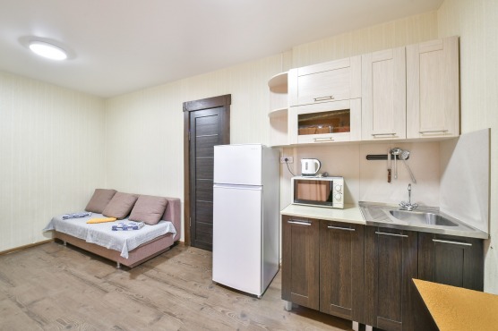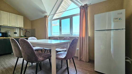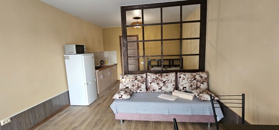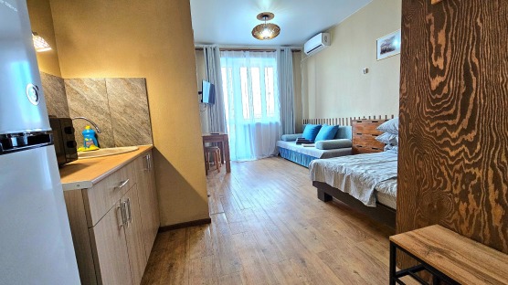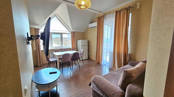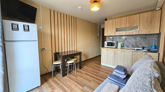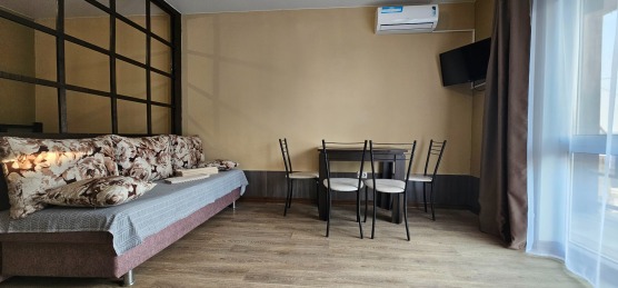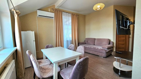 В номере: двуспальная кровать и двуспальный раскладной диван, шкаф, чайный столик, камод, кондиционер, кухня для самостоятельного приготовления, телевизор, холодильник, микроволновка, чайник, посуда и столовые приборы на 4 персоны, душ, туалет, умывальник.