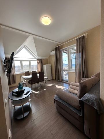 В номере: современный ремонт, мебель, кондиционер, телевизор, холодильник, стол, стулья, кухонная зона, микроволновка, чайник, эл.плитка, посуда, стиральная машина, фен, балкон с шезлонгами, красивый вид с балкона.
