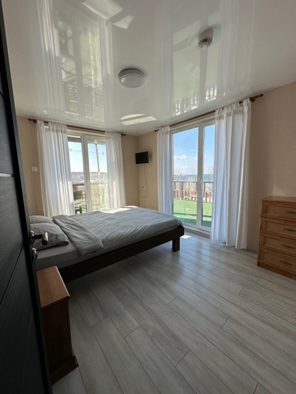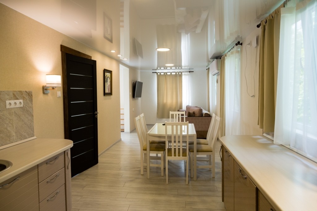 В номере: двуспальная кровать и двуспальный раскладной диван, шкаф, чайный столик, камод, кондиционер, кухня для самостоятельного приготовления, телевизор, холодильник, микроволновка, чайник, посуда и столовые приборы на 4 персоны, душ, туалет, умывальник.